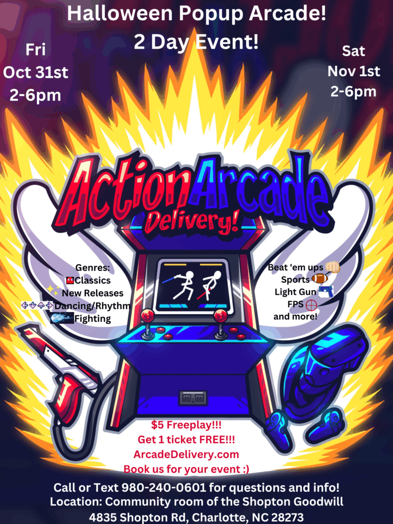 The arcade will be in the community room of the Shopton Road Goodwill @ 2-6pm on Friday Oct 31st and opens again on Saturday Nov 1st 2-6pm.